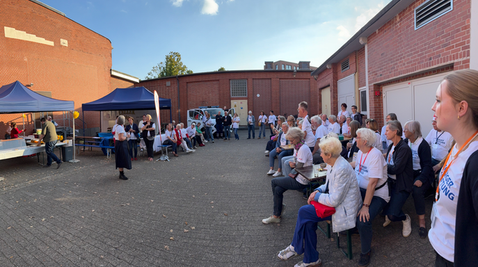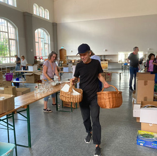 Am Freitag, 26. Sept haben sich die Helferinnen und Helfer um 12 Uhr in der Halle getroffen, um sich mit den Verkaufsständen vertraut zu machen. Das war 2 Stunden vor der Eröffnung, es standen ungefähr 10 Kunden schon vor dem Tor. Die Schlange der Wartenden sollte sich jedoch in der Zeit erheblich verlängern.